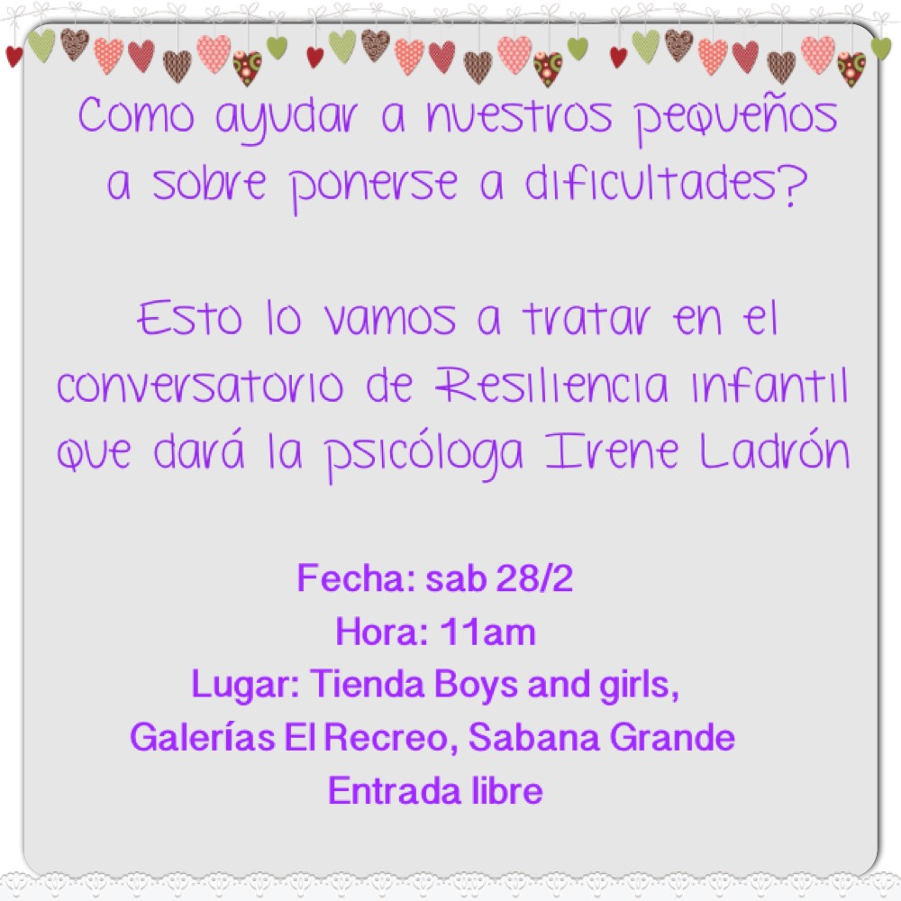 El sabado 28 de febrero a las 11am se realizará un conversatorio sobre Resiliencia infantil con la psicologa, Irene Ladron (@infanciaenmas)en nuestra tienda. Entrada libre
